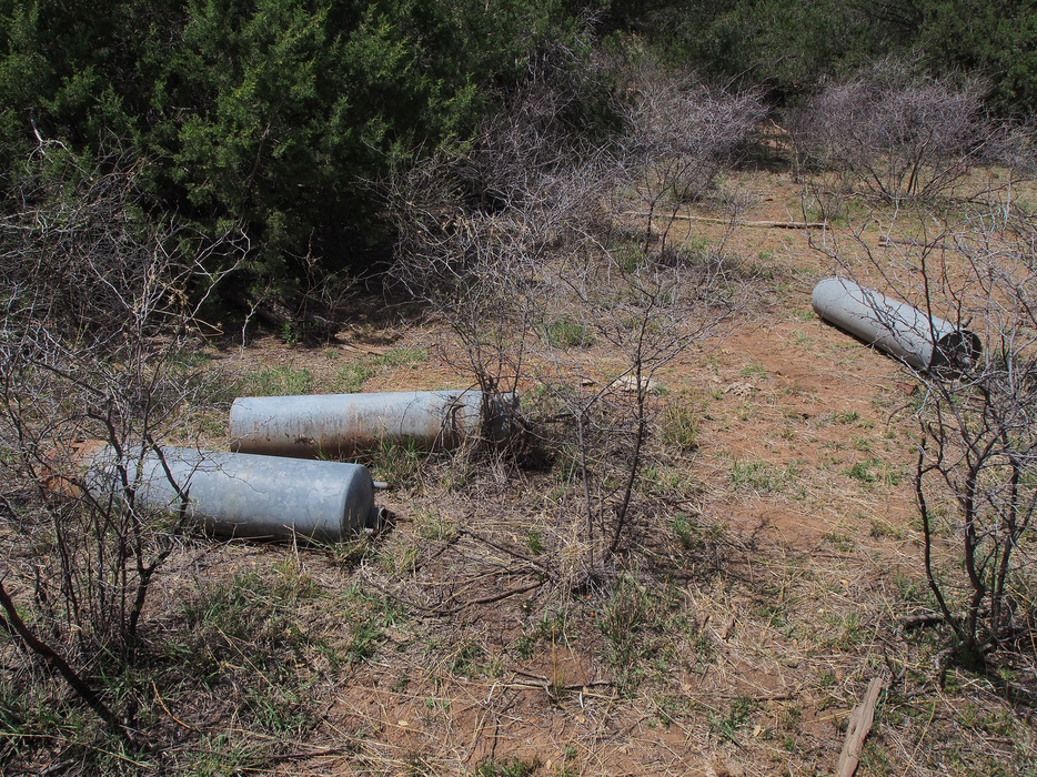 There were a number of these cylindrical pressure tanks scattered around. It appears that some had the ends removed with an acetylene torch and the resultant open ended cylinders were used as pipes. One may have been used as the heat chamber for the duct in the fireplace.