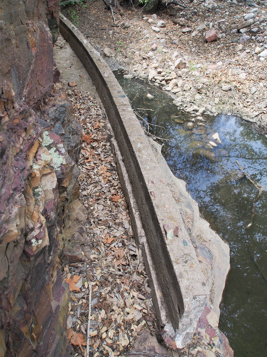 Cement walled flume along the edge of the cliff directed water from a side channel of Cherry Creek to what appeared to be an irrigation ditch. Not sure if the rocks stuck in the top of the cement flume wall were ornamental or functional. Some of the rocks were sharp edged - maybe placed there to keep cattle from stepping on the wall?