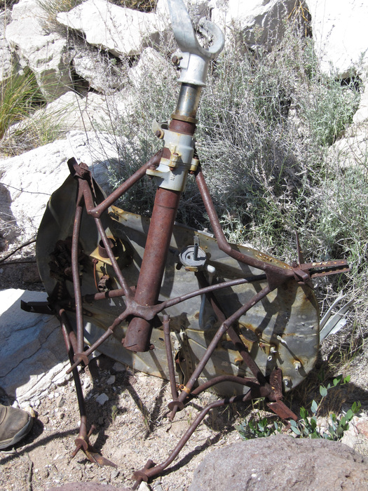 The frame which origninally held the engine with the four threaded studs seen in the bottom 1/3 of the photo. It is positioned upside down with the nosegear pointing up. The aluminum fork which held the front wheel is badly bent and partially melted.