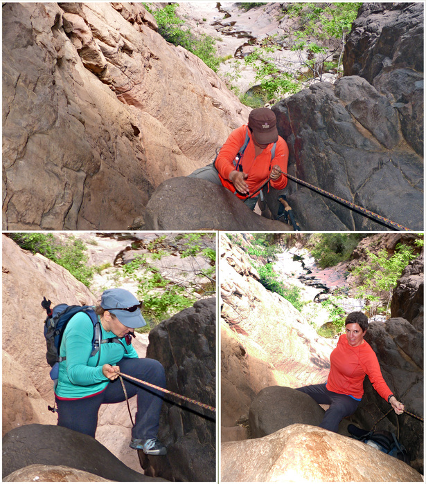 climbing to the right of the chockstone into the rabbit hole. I have some of this action in Part 2 of 3 in the videos. Sarae rocked this section. Tiffani in LR was riding the rock while Wendy was trying to figure out the best way to get her body up and over the rock. It tisn't easy and good thing there is a rope as it is sooo slippery. It would have been a little easier if they had knots tied in the rope but we were glad just to have it.