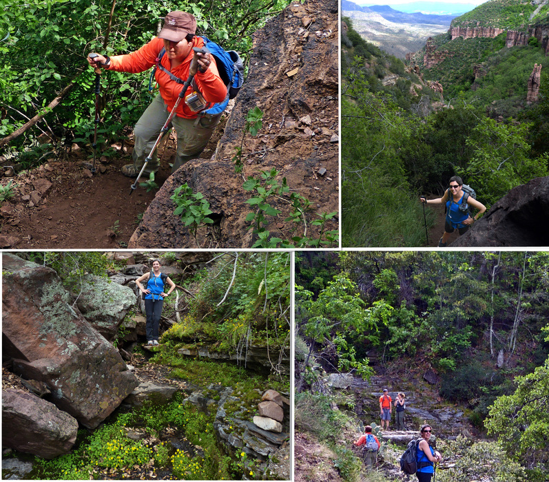 UL is after crossing over the giant centipede we had to step over (he was under a rock but I still made haste). UR is Tiffani at the boulder area in the previous photo just before the last climb up. LL is in a pretty area not too far from the creek (near the mossy area) before we have to struggle up and the LR photo is a bit of a shelf at the top of what I call the second tier of the canyon (it's a good resting area).