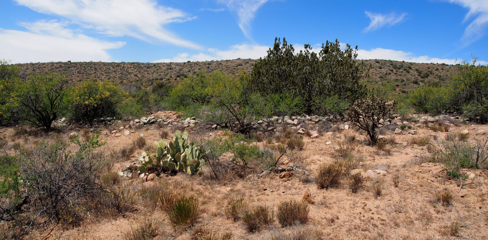 The remains of a long exterior wall partially enclosing the site on the south side.