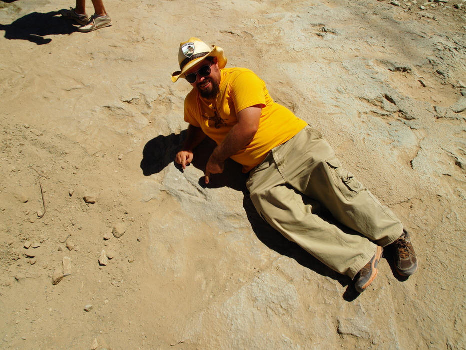 A large dromeosaur ("raptor") track we found. Yours truly for scale.