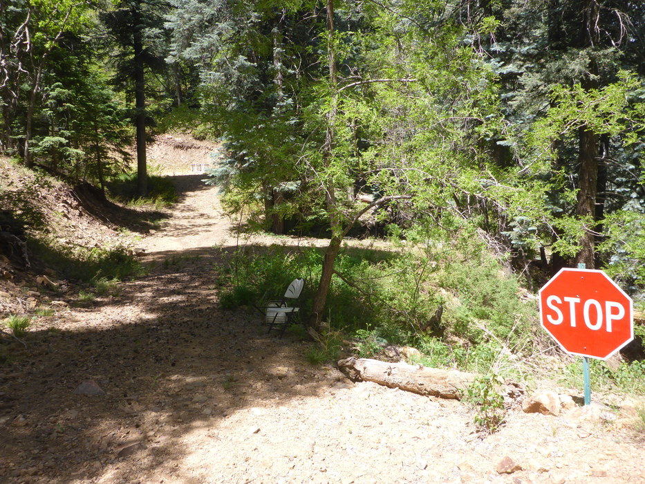 Back up to the stop sign. Chair for a guard? Survivalist compound? Meth lab? I called out, but was not answered ... or shot at.