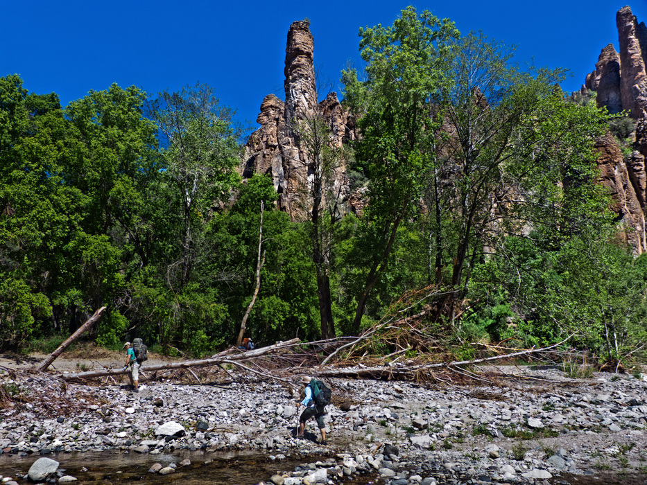 crossing the Middle Fork and making our way around the tree debris.