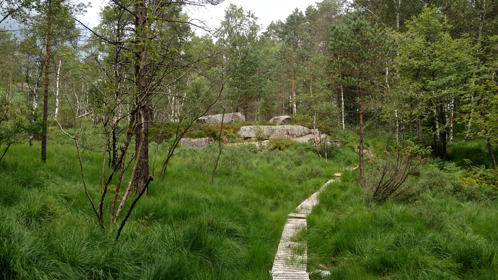 Wooden walkway across a marshy area. A picnic table sits along the trail.