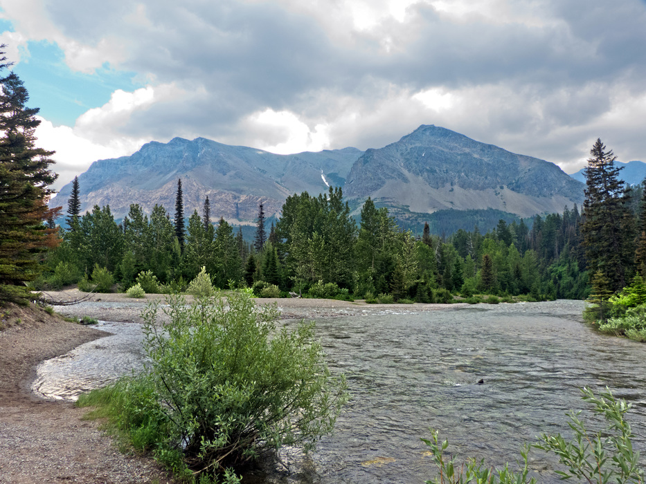 looking to the south after crossing the bridge. Not sure if Mt Henry or part of it is on the left. Appistoki on the right was named by R. T. Evans, a topographer who worked on the early map of the park. It is reported that he inquired from his Indian guide what word the Blackfeet used for "looking over something," and the guide, misunderstanding the meaning of his question, gave him the name "Appistoki," for the Indian god who looks over everything and everyone.