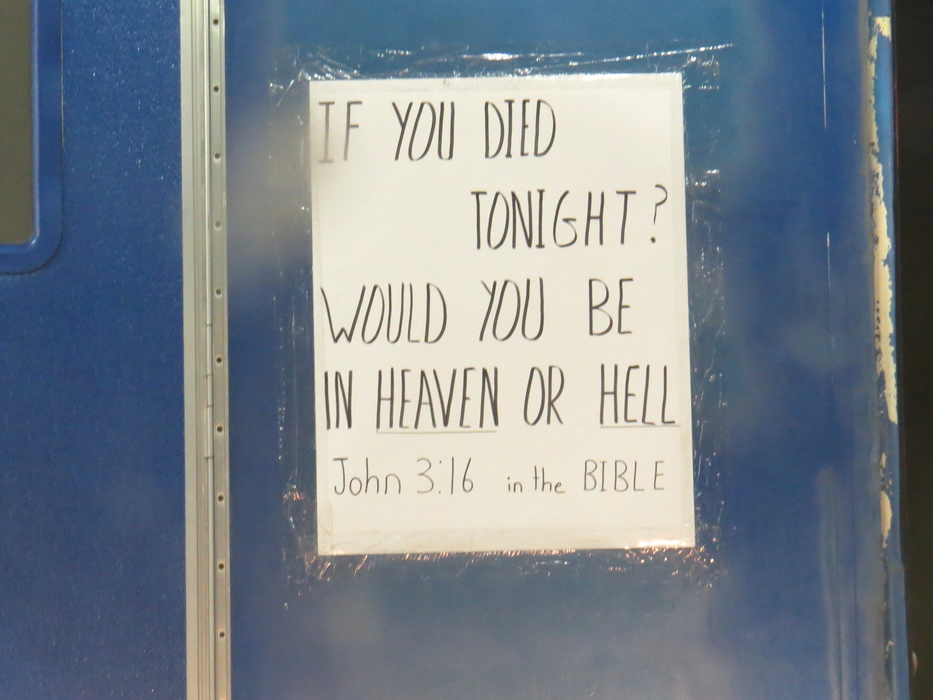 Not only did this guy skipped Sunday school (that's not John 3:16), but he obviously didn't pay attention in English class. Nice grammar, dude. Question mark goes on at the end of the sentence, not in the middle where the comma should be.