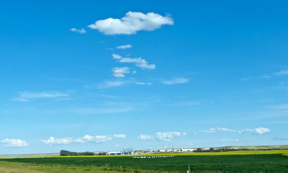 The Kingsbury Hutterite Colony outside of Valier, MT. They keep expanding. Those are bee boxes. We noticed this year that some of the boxes would have light blue paint on them rather than all white.