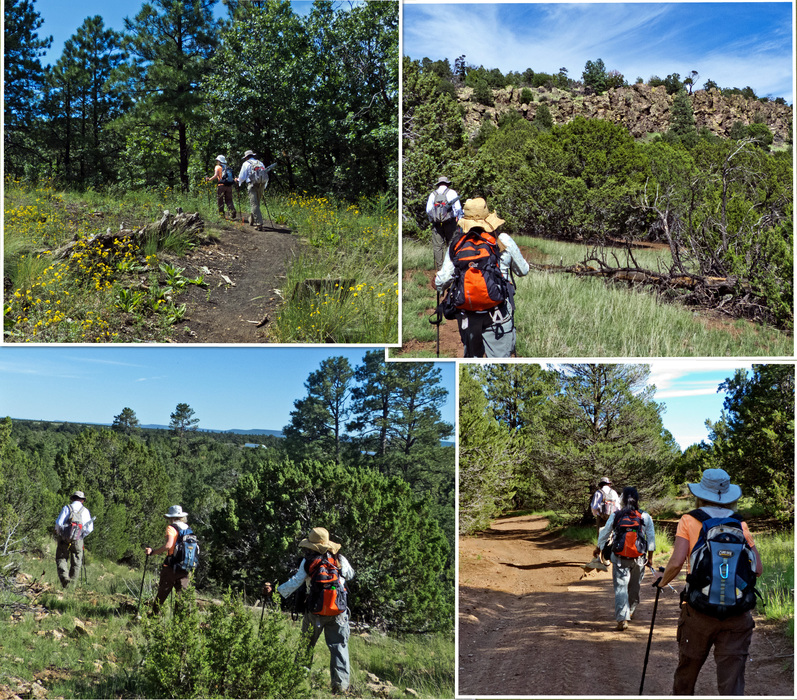 Arizona Trail Section Crew on the trail. UL around 1:49 just after Rio de Flag with the rest being the last part of the hike: UR at 2:54 but what I thot was interesting here is a sudden rock outcropping, LL heading east backtracking cross county at about 3:53PM, LR back on the trail around 4.