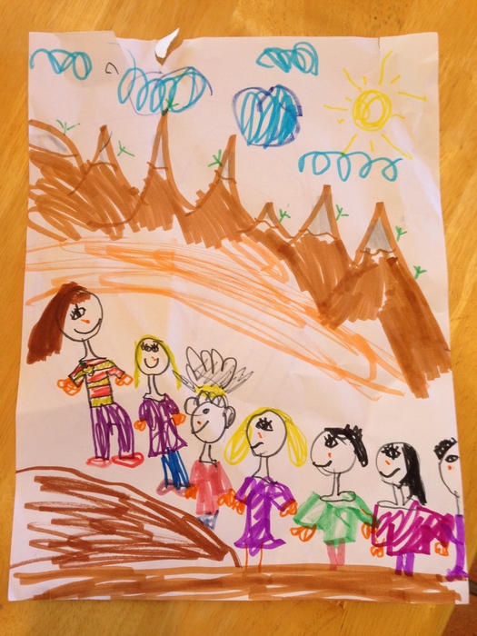 Kids were so excited about me being in "school". Caroline (5 yrs) said "Mommy I'm so proud of you." then she drew this picture of me leading a hike and she is the kid leader and then a pack of kids coming with us on a Nature Guide hike