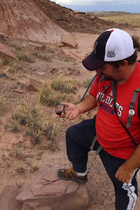 Rob points out a fossilized crocodile-like dinosaur vertebrae. Rob was a bone magnet with fresh "finds" exposed by the recent rains...