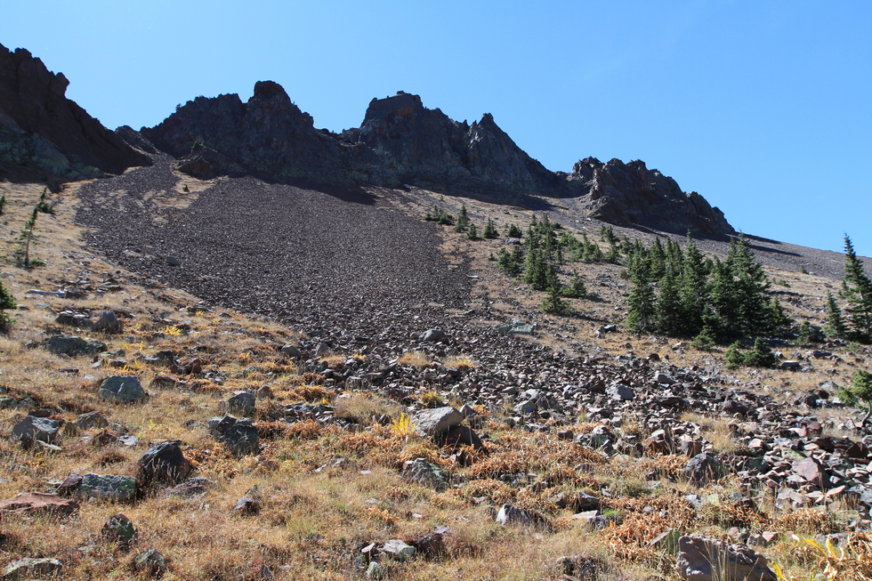 lunched at the bottom of this rock slide, a small rock tumbling down got our attention quick quick