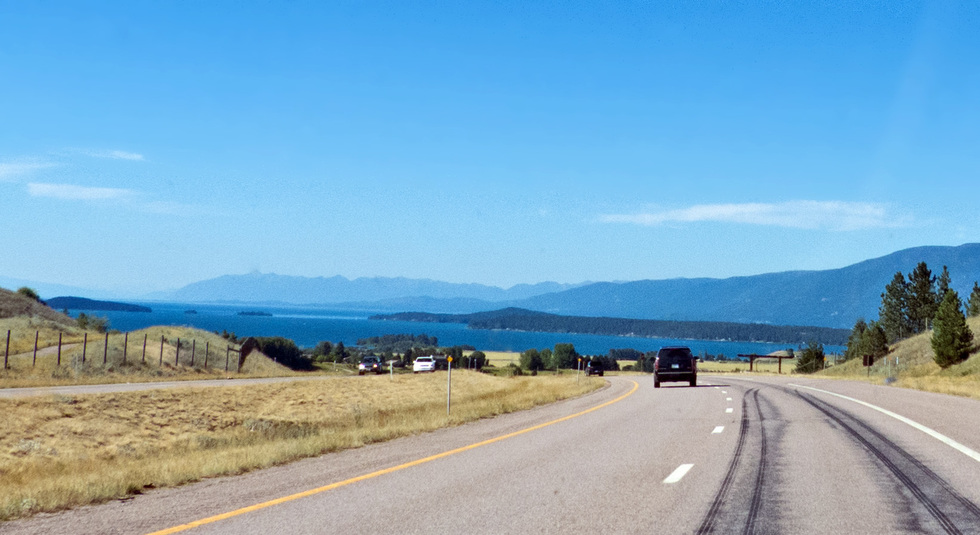 and here we are on the south side of Flathead Lake just outside of Polson, MT looking North. Polson Bay is on the left, Finley Point on right. To the right of the point is still part of the Mission Mountain Range. The mountains to the north are part of the Swan Range. Polson Bay, at the lake's outlet was raised 10 ft by Kerr Dam. It is one of the cleanest in the populated world for its size and type.
