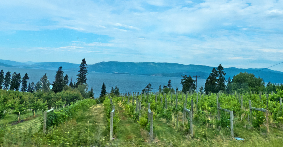 The Flathead valley was formed by the glacial damming of the Flathead River and sustains a remarkably mild climate for a region located this far north and inland; the Pacific Ocean is almost 400 miles to the west. The mild climate allows for cherry orchards on the east shore and vineyards for wine production on the west shore. There are also apple, pear, and plum orchards around the lake as well as vegetable, hay, honey, nursery tree, Christmas tree, sod/turf, and wheat production bordering or near the lake.