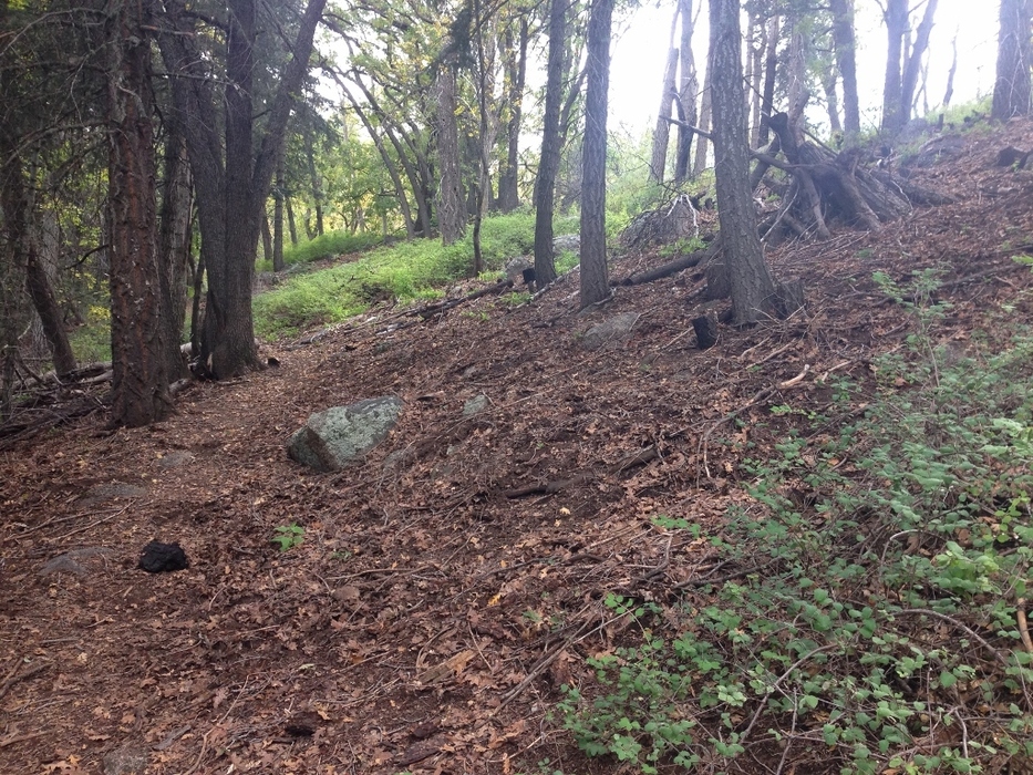 Deer crossing. The area heading up and down the hill (left to right) is chewed up from what appears to be deer traffic.