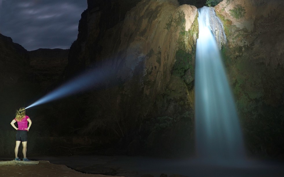 her headlamp illuminated the mist
