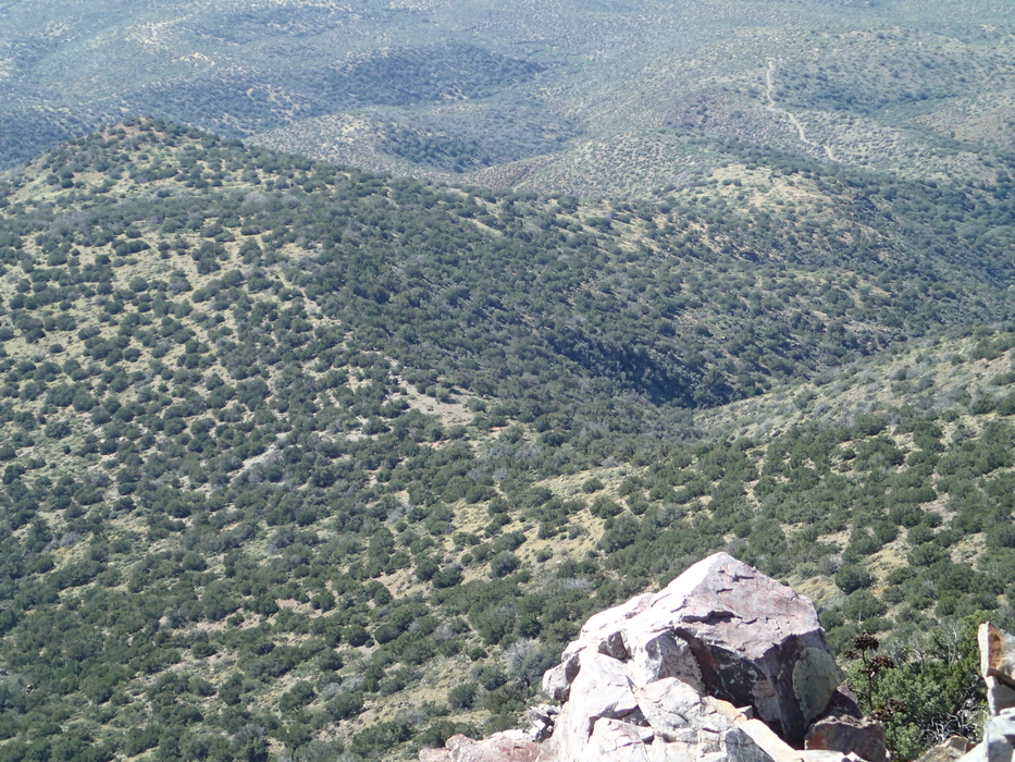 View southwest below Peak 5356. Part of Forest Road 649 is visible in the top right.