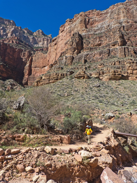 Clyde starts hiking again after telling folks about how the water gets to the South Rim from the north. All of the water that is used on the south rim comes from Roaring Springs, at the junction of Bright Angel and Roaring Springs Canyons on the north rim. The water flows through a pipeline from the pumping station at Roaring Springs, down Bright Angel Canyon, across the Colorado River, and up to Indian Gardens, from where it is pumped up to the south rim. Breaks in the pipeline are not uncommon and can raise havoc with the water supply on the south rim.
