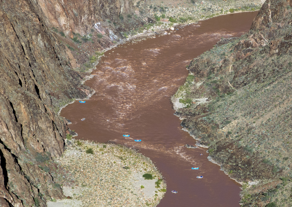 Looking down at the rapids and the beach where the boaters are heading for.