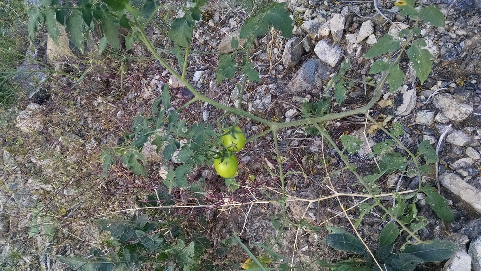 Tomatoes?! Right along the Alta. I could see how this could start growing... someone doesn't like the T in their BLT and tosses it on the trail, and a few months later you've got tomatoes. But how the heck has this thing been surviving without water? And how have the birds not gotten to them? Crazy.