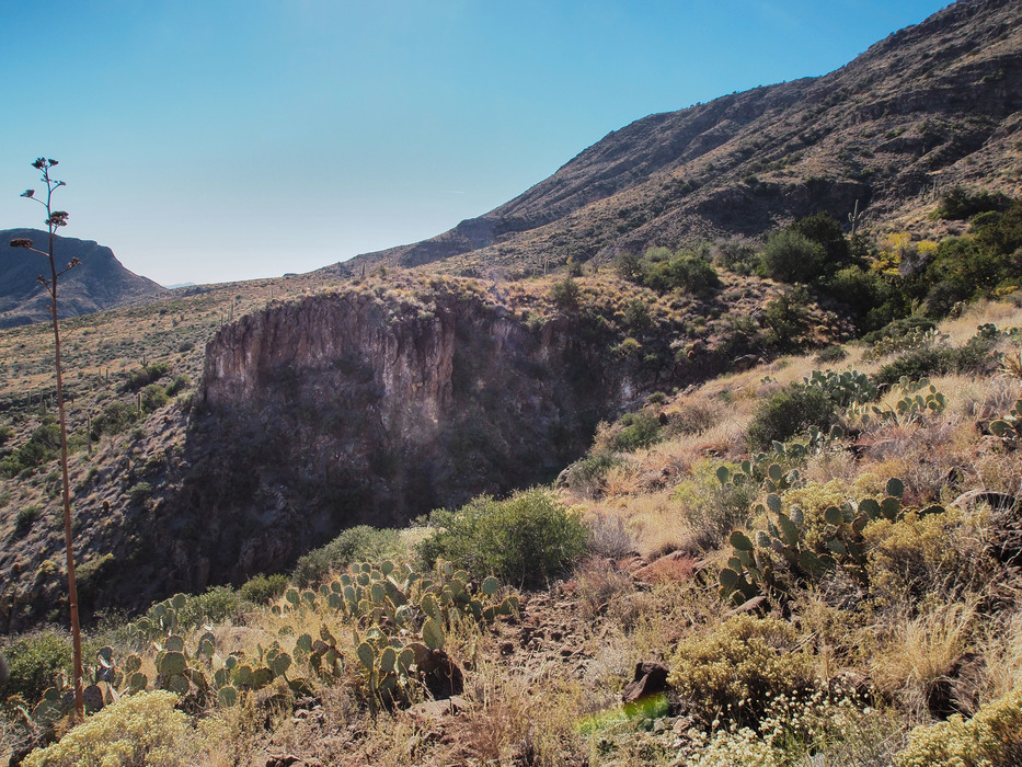 I traversed across the hill side to check out a possible spring location in this ravine and possible ruins on the cliff top. No ruins, petroglyphs or pottery sherds were found there.