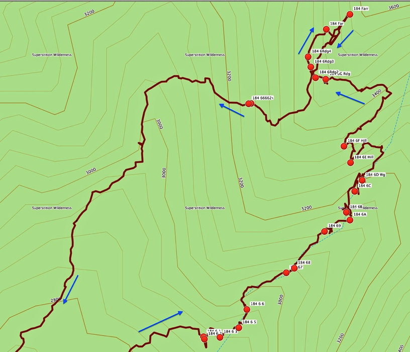 My track - All but two red dots mark wreckage.