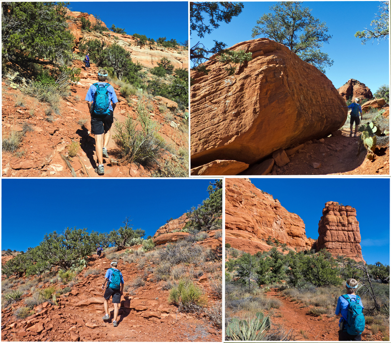 Kelly on the trail or in the case of the left photos, UP the trail; right photos are on the first bench.