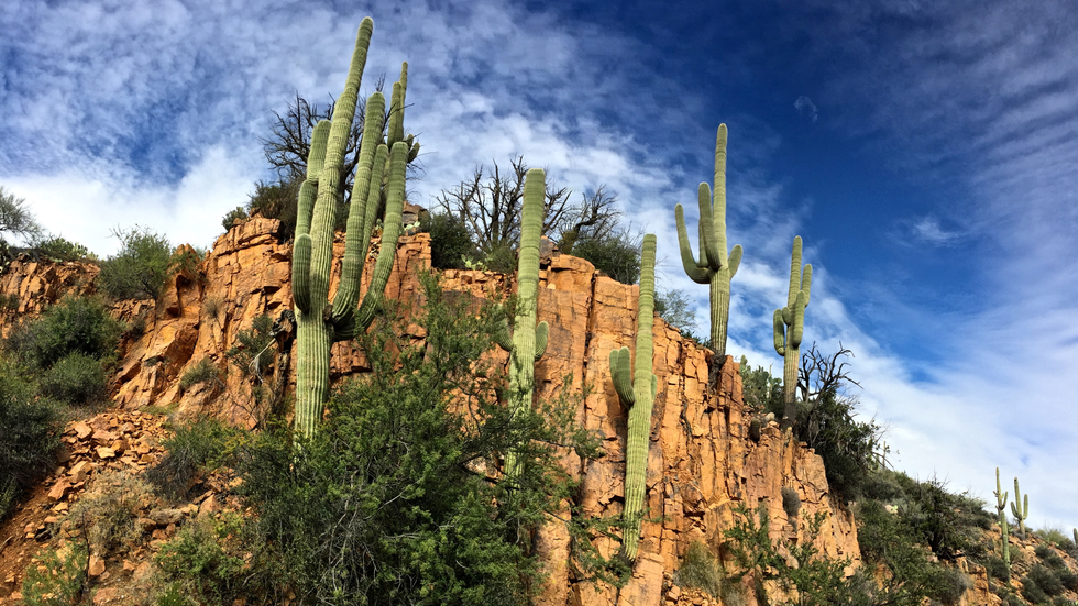 A hillside of Saguaro growing out of the rock.