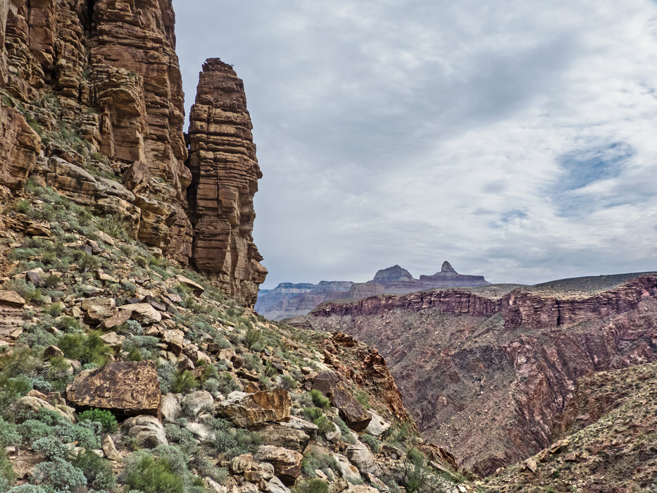 starting our way down this very steep section. It looks like that one section of the rock face could fall away at any time. Zoroaster and Brahma Temples in distance.