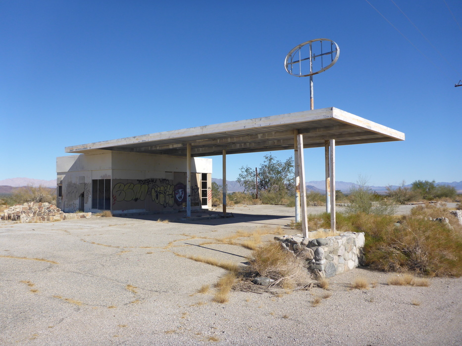 Old gas station -- from the shape of the sign, I'm guessing an Esso -- about two miles west of Desert Center.