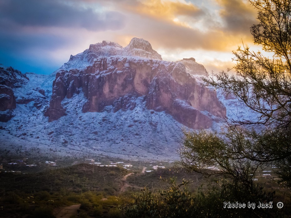 A view of Superstition Mountain showing the snow coming all the way down to the edge of the Wilderness.