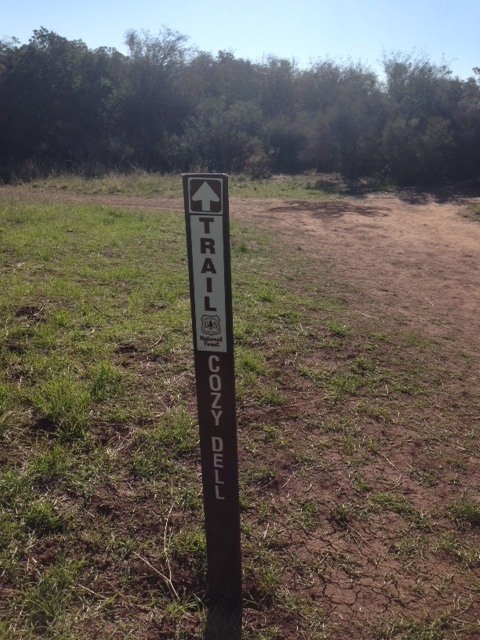 Cozy Dell trail sign near a trail junction along the trail. Signs of trail horses and motorbike ruts were visible in the area.