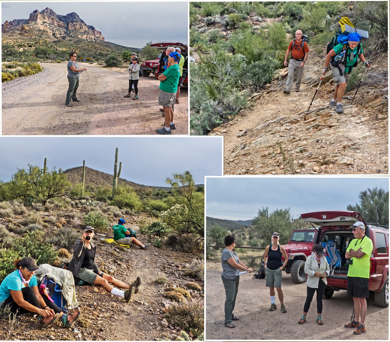 at the TH Wendy, the new event organizer for the AZT (but not at the time yet) gave us information about our weekend. The other two photos are from our rest break where we faced toward the west admiring the view of the Superstitions. The LR is Cindy and Roger (Not Yet) as we hiked that first part.