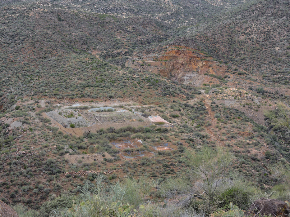 Silver Cross Mine. The remains of the cyanide heap leaching used to dissolve the gold out of the crushed ore scar the landscape. Plastic liners were placed under the heaps to prevent cyanide from leaking into the ground water. Not sure how well that worked.