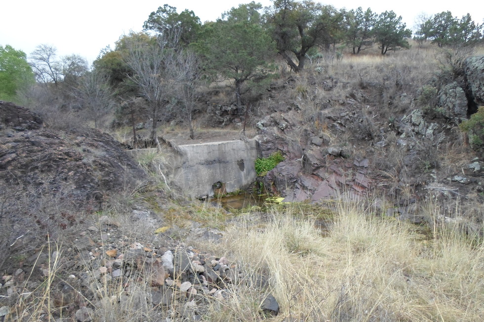Cement dam at Down Under Tank - plenty of water flowing where you see the greenery to the right of the dam in the rocks