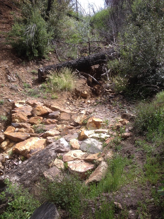 ATA had ACE do some stabilization work after the fire in the steep wash south of McFarland. The photo levels this terrain out, but the close end of the rock armoring is probably 10 feet below the trail. Holding so far, but this is a steep, high-volume wash, so may need some more soon.