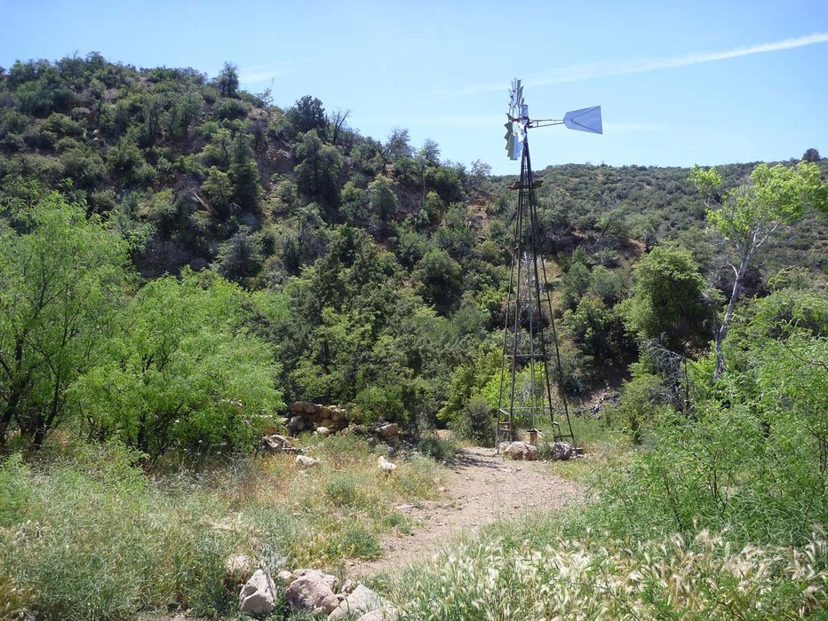On the property with the stone cabin, a shiny windmill that works without screeching.