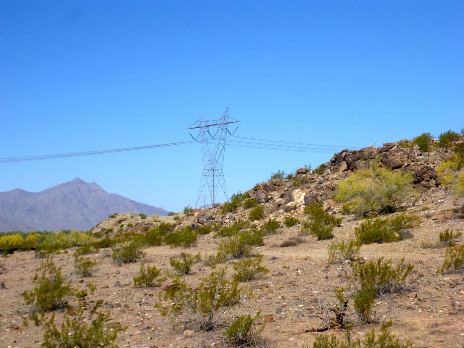 The new freeway will pass between the Tower of Power and the petroglyphs. Note the yellow cord protecting the bees from aggressive petroglyph hunters.