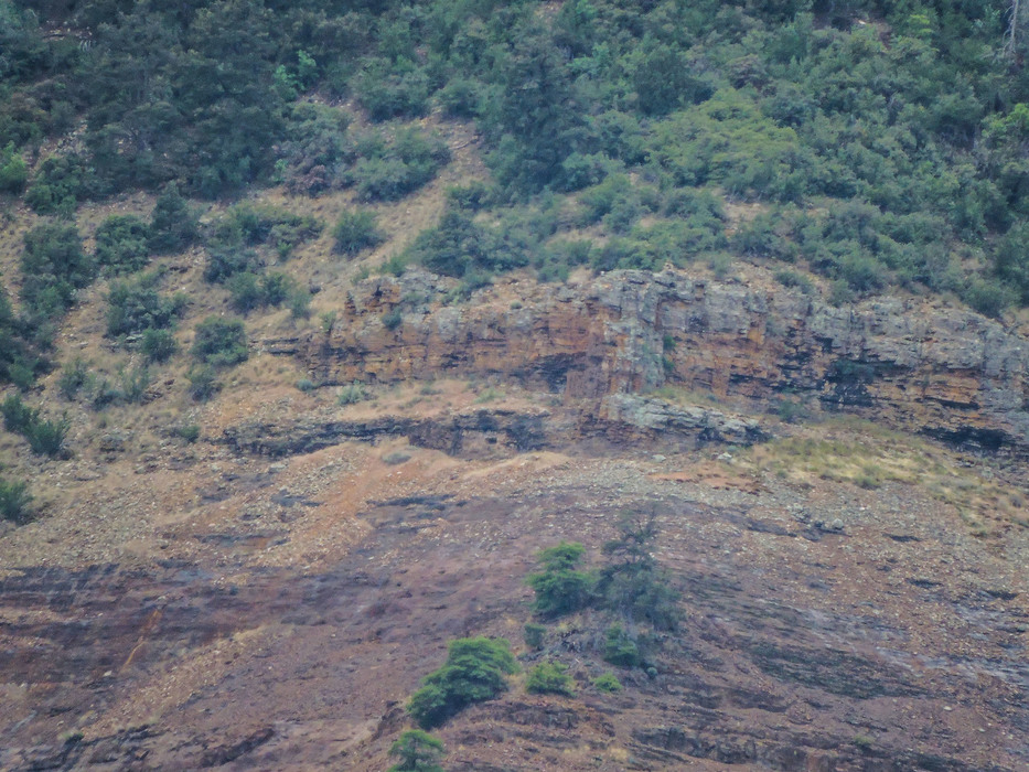 A zoom-in on what sort of looks like a window or doorway in a cliff dwelling wall to someone with a good imagination and a desire to find cliff dwellings. However this most likely is just a trick on the eyes due to distortion with the supper zoom. It could however be the opening of a uranium mine. The Sorrel Horse mines (6 adits) were located somewhere near this spot.