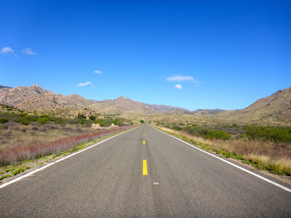 AZ-266 heading west through the Coronado National Forest / Pinaleno Mountains. Beautiful boulder formations on this route. Only saw three cars, so standing in the middle of the road for a good shot, was not dangerous. This pic was taken a half mile east of Gillespie Wash (the low point, up ahead).