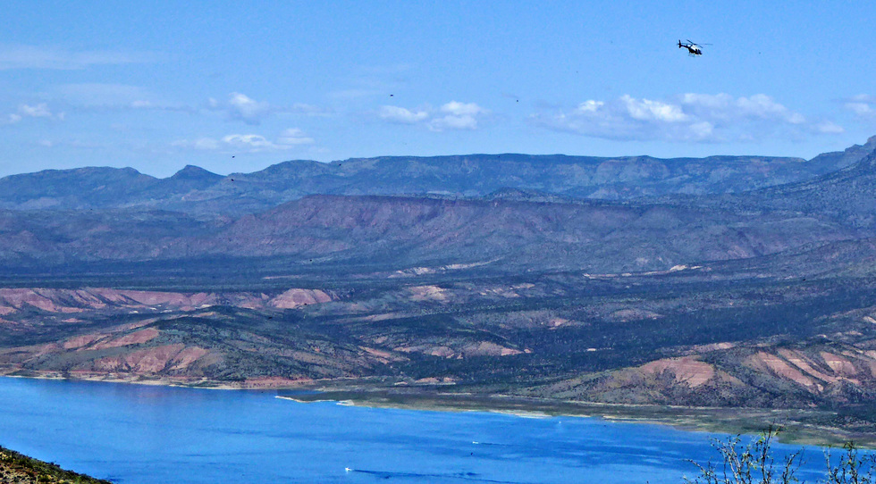 a helicopter over Roosevelt Lake and other birds in the air as well. and boats in the water. Looking N.eastish.
