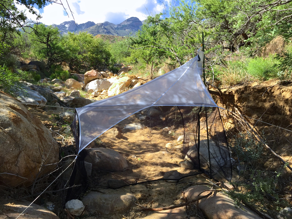 Scientific study that captures insects. I saw two of these ... I'm sure there were more. A note on it gives a website (incorrect, but I found it anyway) and pleads not to disturb -- in Spanish. Because apparently people who travel in desert washes don't read English? Oh. Nevermind.