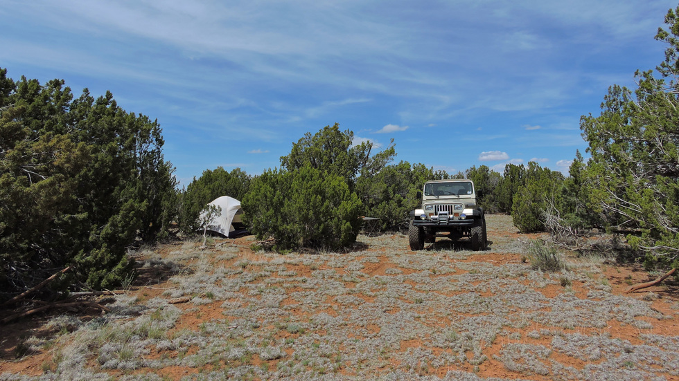 After setting up camp on the day of arrival. The wind was howling across the flat San Francisco Plateau so we took shelter behind the Juniper trees which did a fair job of blocking the wind. My camp is hidden behind the Juniper on the right side of this photo.