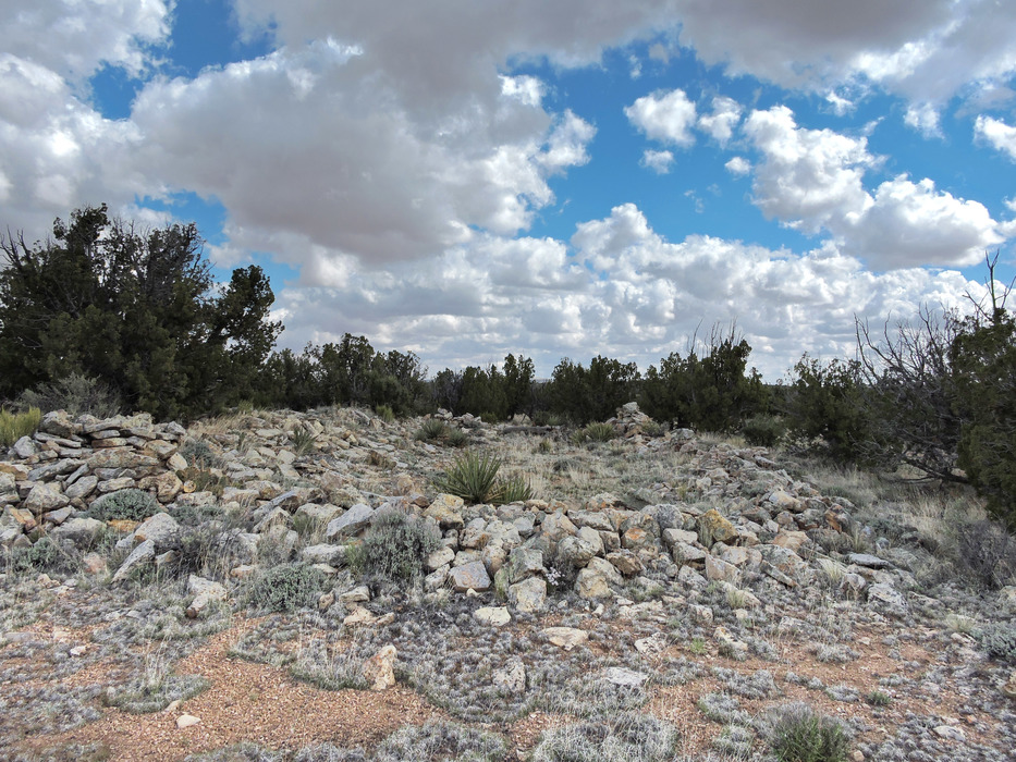 We encountered numerous ruins on the canyon rim as we approached the fortress ruin. The huge pile of rocks outlining this wall indicates it was quite high. This rectangular section was large and probably enclosed a courtyard. There were 4 to 5 rooms hidden by the trees along the outside of the left wall.