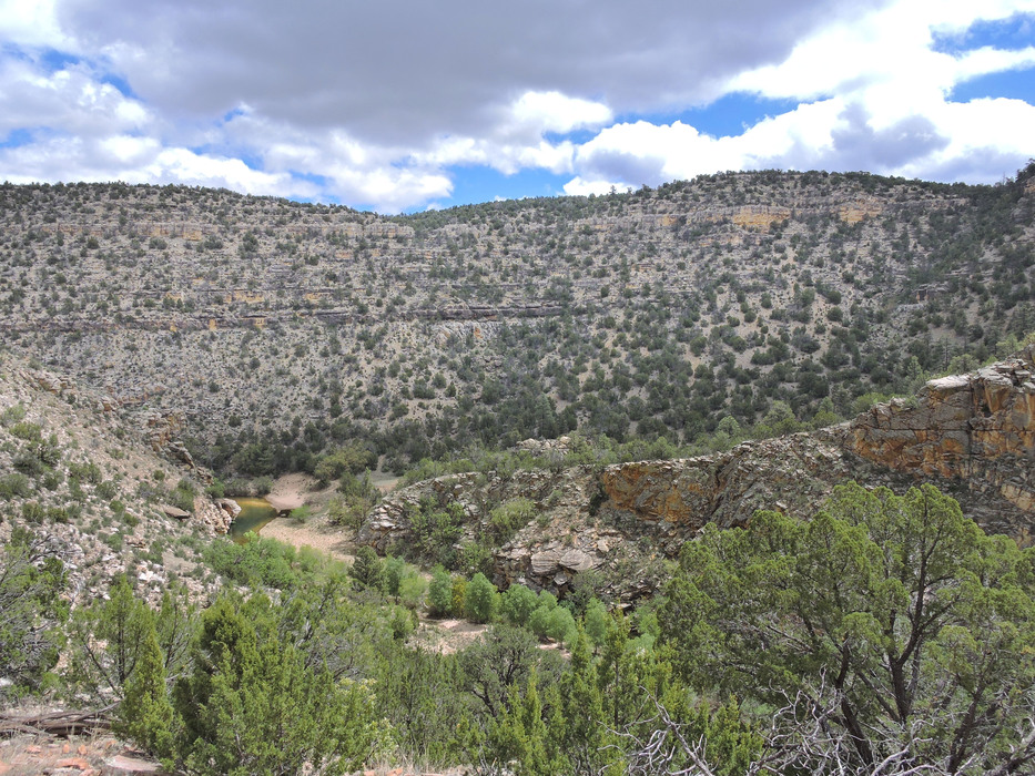 Looking down on the location where the official HAZ gps track for trail #45 ends in the canyon bottom. Maps show the trail continuing up the other side of the canyon. My best guess is that it goes up a draw from left to right from the area tagged as trail end in this photo.