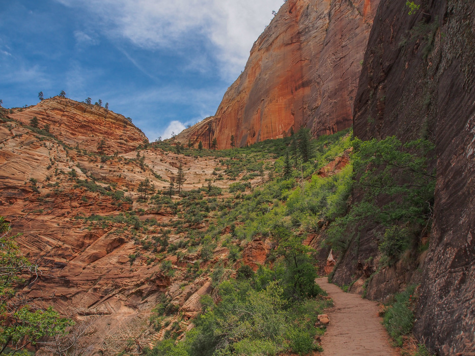 View of the trail as it switch backs up the cliff. The East Rim Trail forks off this trail and continues up the center of this photo. The Hidden Canyon Trail switches back and passes behind/above the cliff face on the right side of the photo.