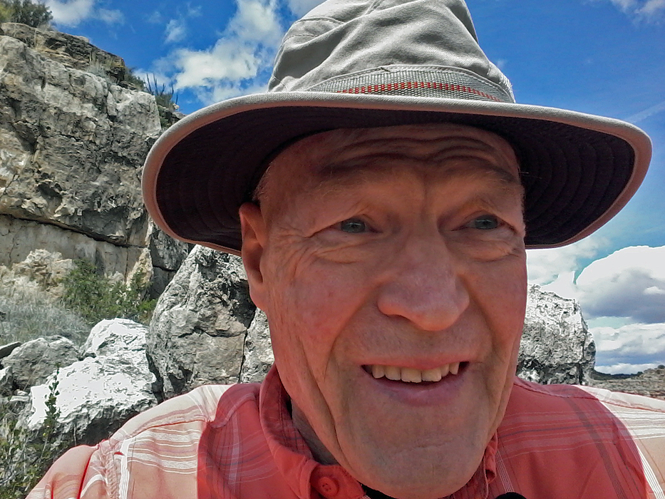 Funny Story- Grasshopper has a new beginner Samsung touch screen smartphone with a 5MP camera pics option & with a 2MP selfie pic option. I had never experimented with the smartphone camera until today. The plan was to take a few landscape pics of this Canyon "Main Event" Fortress with my smartphone and later text with pic attachments to family & friends to impress. When we arrived at the best viewing location for a few smartphone pics, I positioned the camera for a landscape shot and was surprised to see the glare of my face with sunglasses in the display, so I took my glasses off to get a better view of the S-Phone Buttons & Canyon Fortress in the display screen. This pic (the less scary of 3 taken) was my reward. (Being almost blind without my glasses on, I didn't realize I had taken all selfies until later in the day after returning back to Camp G/H)