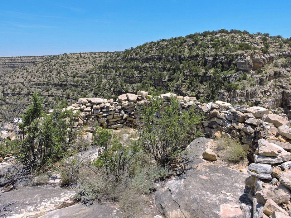 On top of the knob looking over the ruin wall at our route down from the canyon rim. The last cliff climb to reach this ruin was an easy one going up a gap in the cliff on the south side.