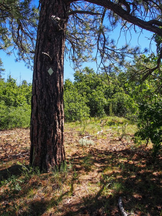 A diamond trail marker tacked to a tree. I suspect these are fairly old and have broken and fallen off of many of the trees as the markers got brittle with age and the trees grew in circumference popping them off of the tacks. I would later find a few of these at the south end of trail 10 where there was no longer any visible sign of the trail other than these markers.